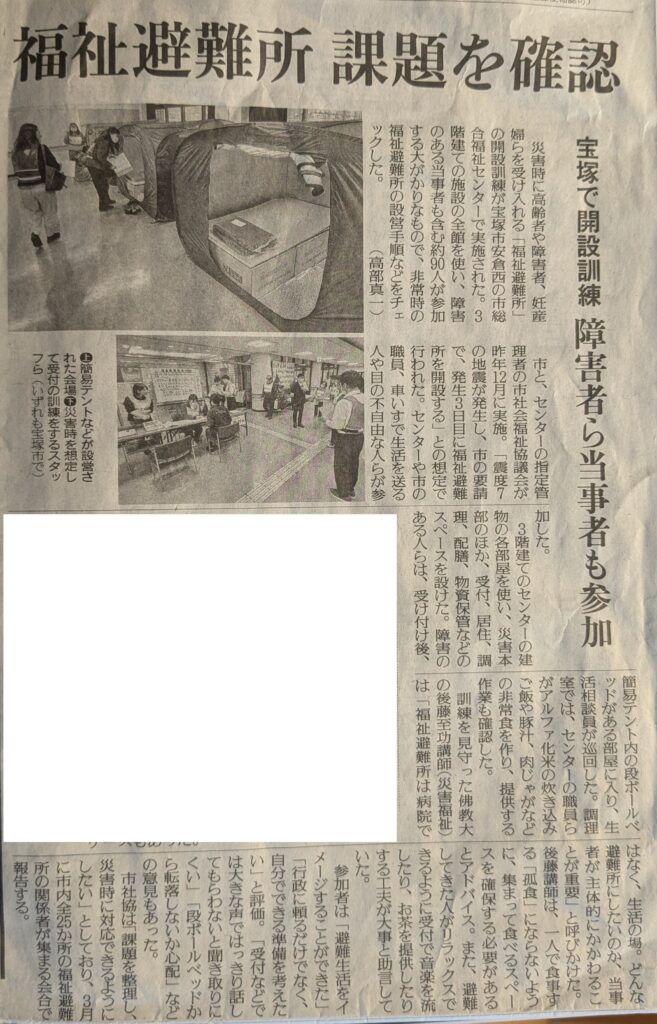 活動報告:福祉避難所開設・受入訓練を見学しました 2025年12月25日 最終更新日時 : 2026年1月14日 tbl2024 日時:令和7年12月25日(木)13:30~16:00場所:宝塚市総合福祉センター 3階大ホール内容:福祉避難所開設・受入訓練参加者:障害当事者とその家族、行政、社会福祉協議会職員主催:宝塚市社会福祉協議会 令和8年1月10日 読売新聞 朝刊掲載記事
