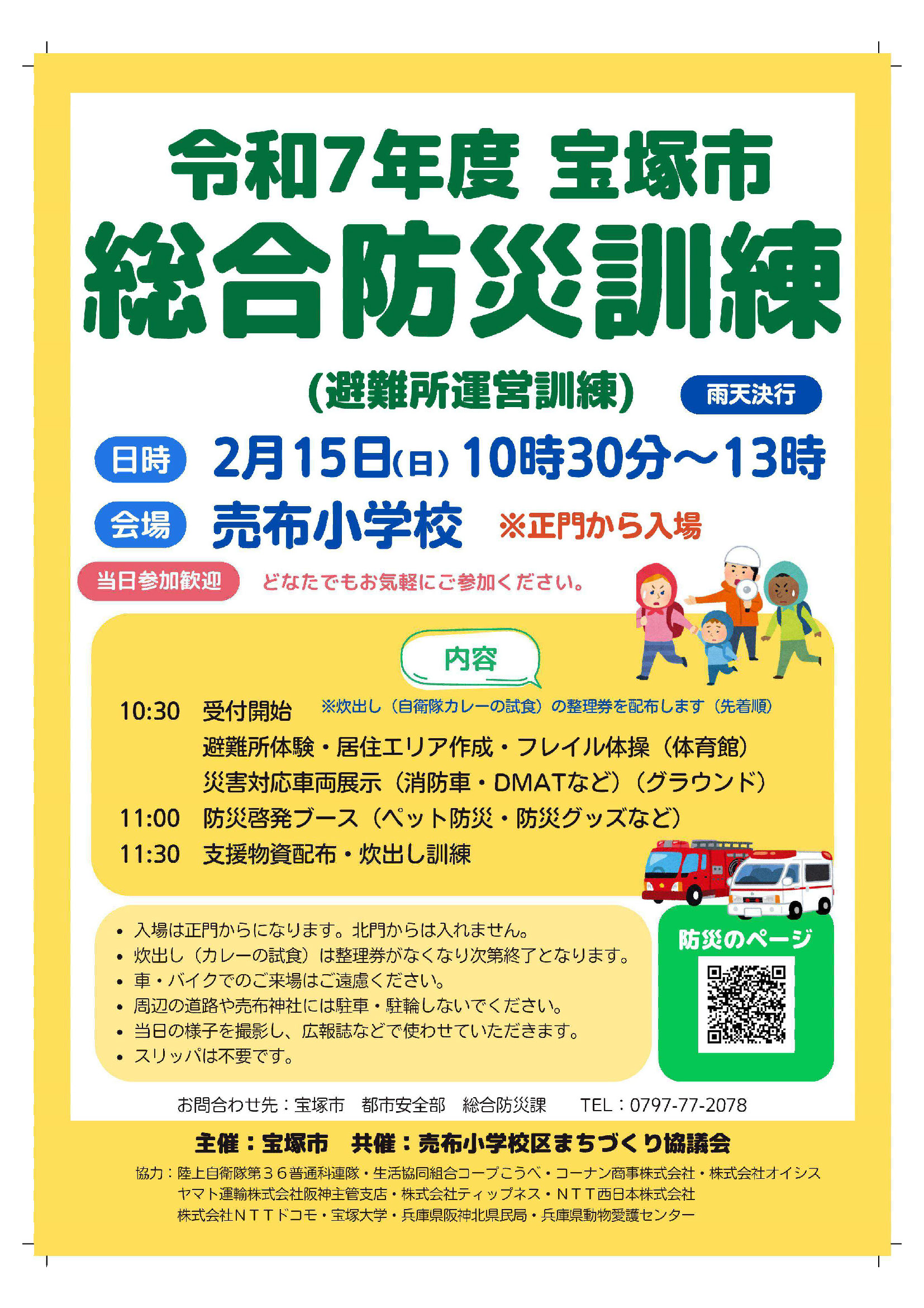 お知らせ:宝塚市総合防災訓練 2026年1月14日 最終更新日時 : 2026年1月14日 tbl2024 日時:令和8年2月15日(日)10:30~13:00場所:売布小学校内容:避難所運営訓練主催:宝塚市共催:売布小学校区まちづくり協議会 令和7年度宝塚市総合防災訓練チラシ(R80215)ダウンロード